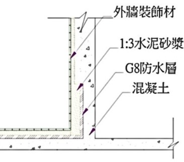 防水層施作於結構體上,屋頂層標準模式施作8層步驟(G8),施作完畢後試水一星期供客戶檢查。