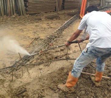 進行牆面泥作工程前,我們用高壓水柱沖洗牆面,將牆面的粉塵清除乾淨,降低減少牆面澎共機會。