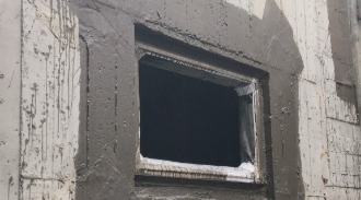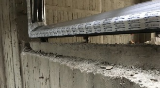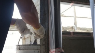 45度角貼不織布,窗框開口四角落黏貼不織布抵抗張力裂縫達到防水效果。