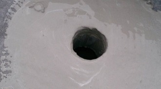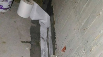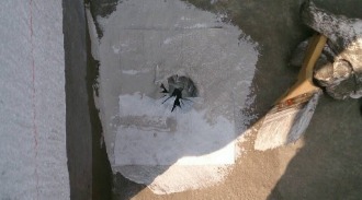 考量塑膠排水管與混凝土日後會因地震而產生裂縫,所以在落水頭的處理,也顯得格外重要,我們先檢查落水頭是否在正確認位置上(管心到牆邊約5~6公分位置),將排水管切割至混凝土平(略低),將排水管周邊用益膠泥批平,彈性水泥塗佈後,不織布內凹進管內,將防水層延伸至管內,保護日後管壁與RC產生裂痕而漏水。