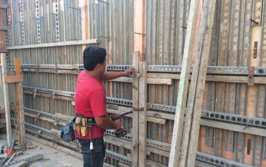 外模角材固定極為重要,避免灌漿時,傾斜或爆開。
