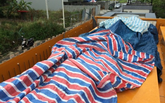 吊放鋼筋時天候不佳,所以覆蓋帆布避免鋼筋生鏽繡水停留模板上,導致日後灌漿不美觀。